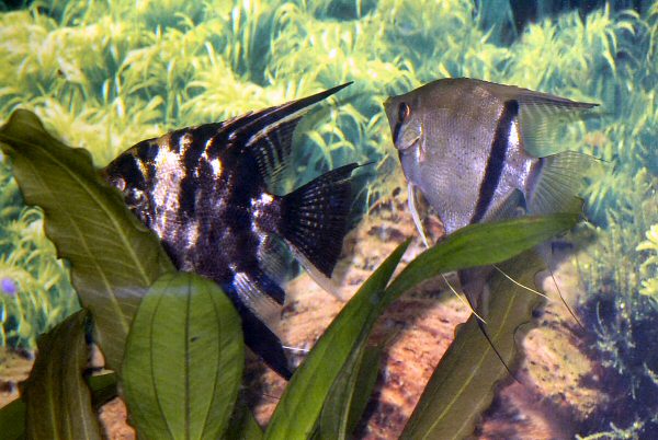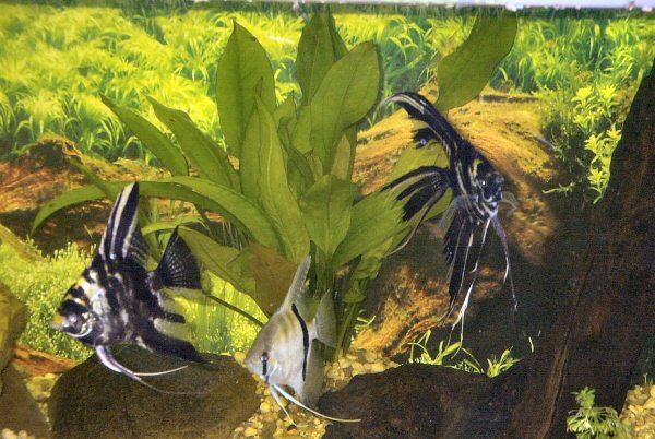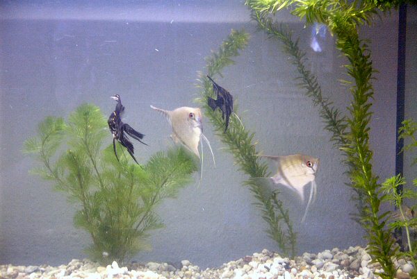 Bewohner dieses Aquariums sind vier Skalare und sechs Panzerwelse.