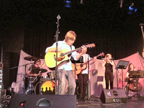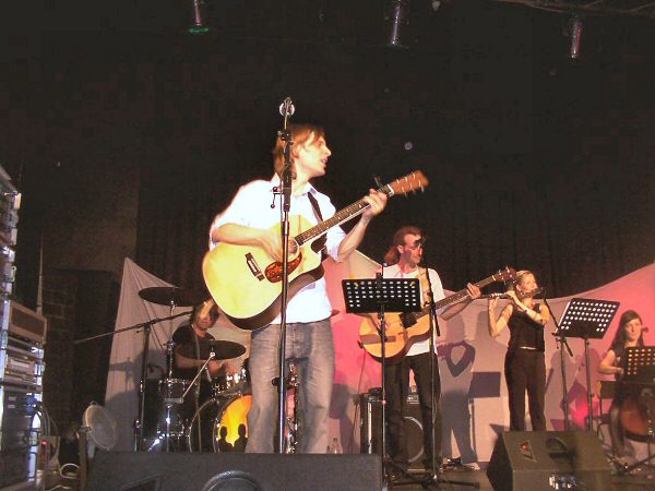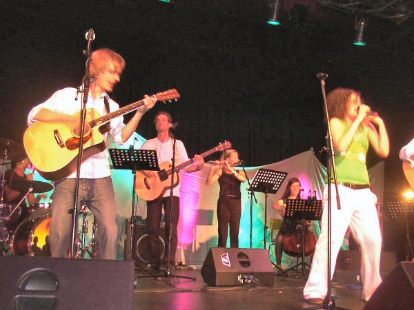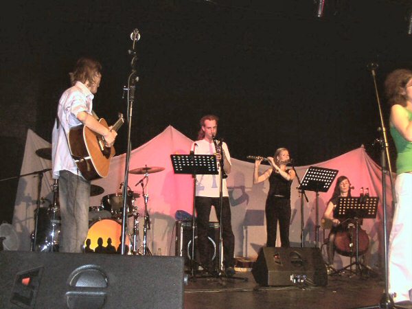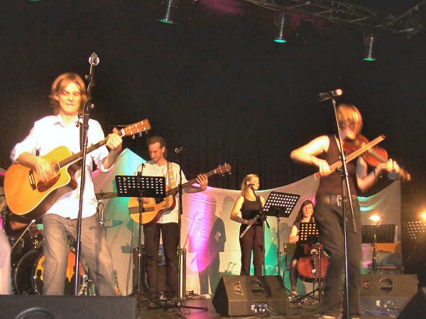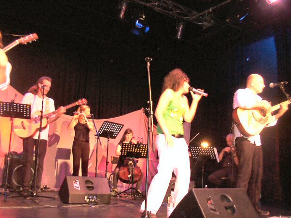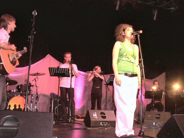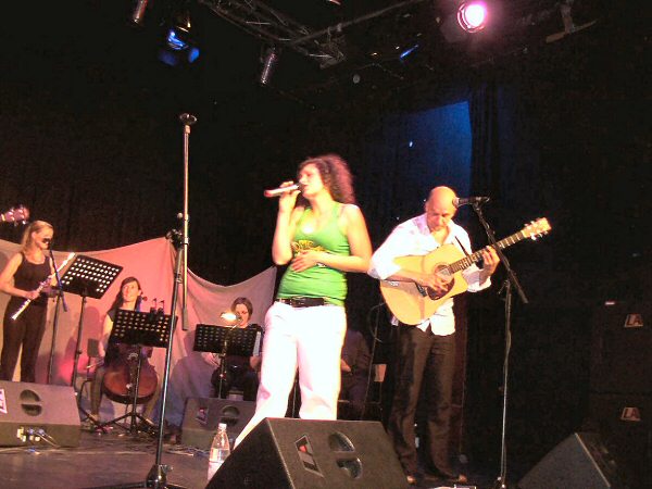 MISS SISA begleitet von einem Streicher-Duo, einer Cellistin, einer Flötistin, Paddy (Goldhouse) mit Baßgitarre und Klarinette und Martin (Goldhouse) am Schlagzeug.